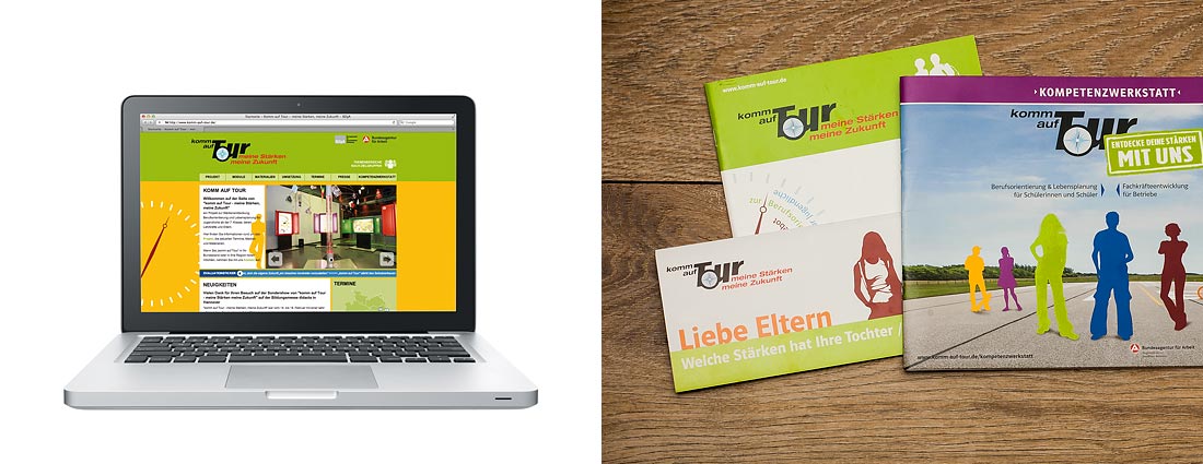 „komm auf Tour – meine Stärken, meine Zukunft“ unterstützt Schülerinnen und Schüler der Klassen 7 und 8 frühzeitig in ihrer Berufsorientierung und Lebensplanung. Die Jugendlichen entdecken in einem Erlebnisparcours ihre Stärken und erfahren, welche realisierbaren beruflichen Möglichkeiten auf sie warten könnten. Wir realisierten hier neben dem kompletten visuellen Auftritt, inkl. Arbeitsmaterialien und vielfältigen Broschüren, die Webseite, Animationsfilme, Give-Aways und einen Messestand auf der Fachmesse didacta.